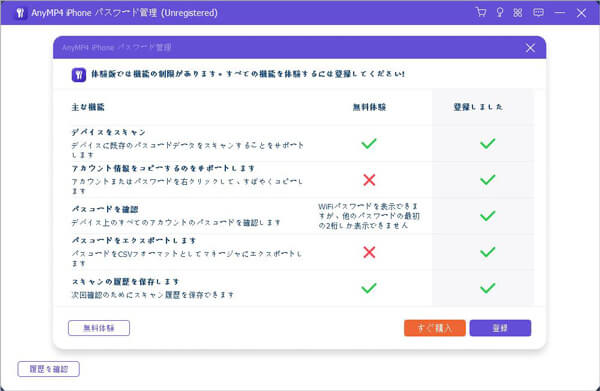 無制限にすべての機能を使用するために、ソフトを登録する必要があります。インタフェースの「登録」ボタン(鍵アイコン)をクリックするか、メニューから「登録」を選択してください。